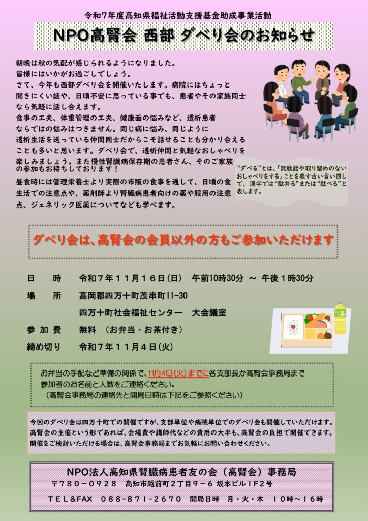 西部ダベリ会のご案内 今年も西部ダベリ会を開催します。 講師には高知医大より西内栄養士、たきぐち薬局さんより薬剤師をお呼びし、勉強・交流を図りたいと思います。腎臓病患者とその家族の参加をお待ちしております。 お気軽にお問い合わせください TEL:088-871-2670 開局時間 10:00 - 16:00[ 月・火・木のみ ] メールでのお問い合わせはこちら